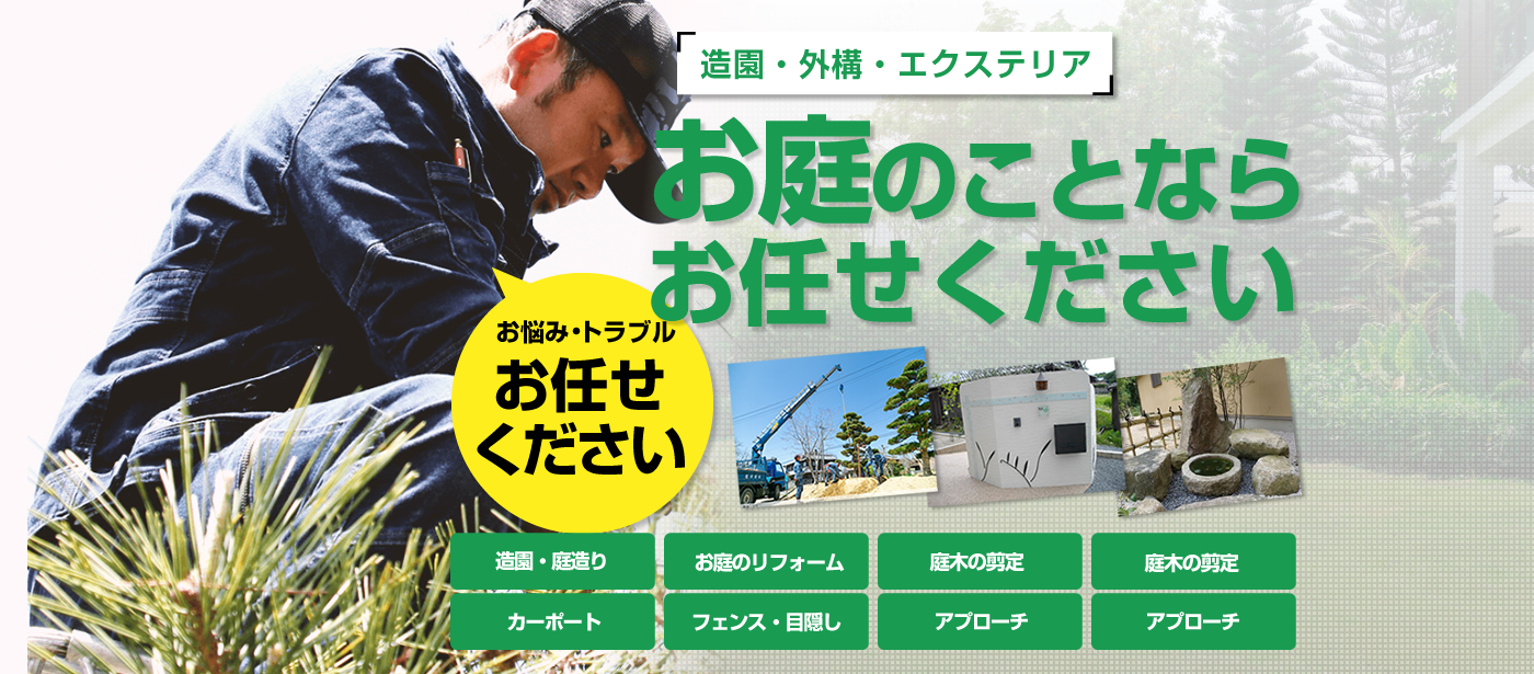 業務内容 | 造園工事・外構工事・土木工事・建築工事 剪定・伐採・草刈等の管理・保全 会社・工場・会館・施設等の緑地管理・保全 建築物及び工作物の設計及び監理 建築及び庭園コンサルティング業 エクステリア商品の施工・販売 植木の生産・販売 太陽光発電所(メガソーラー)の敷地管理 |